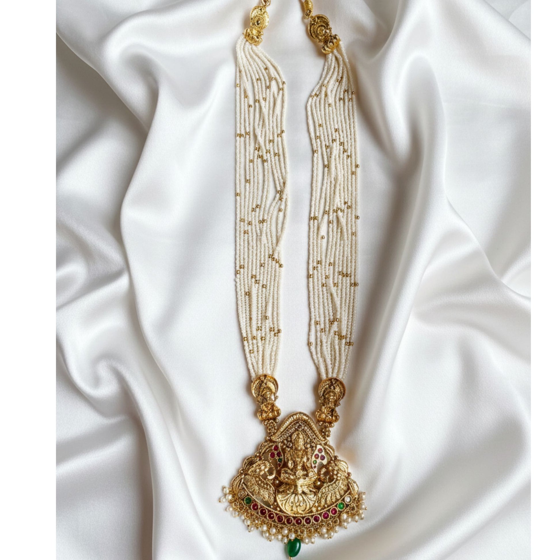 Elevate your festive attire with our Goddess Laxmi necklace set. Adorned with delicate pearls, this set exudes elegance and sophistication. Perfect for adding a touch of traditional charm to any outfit. Don't miss out on this must-have accessory for the season.