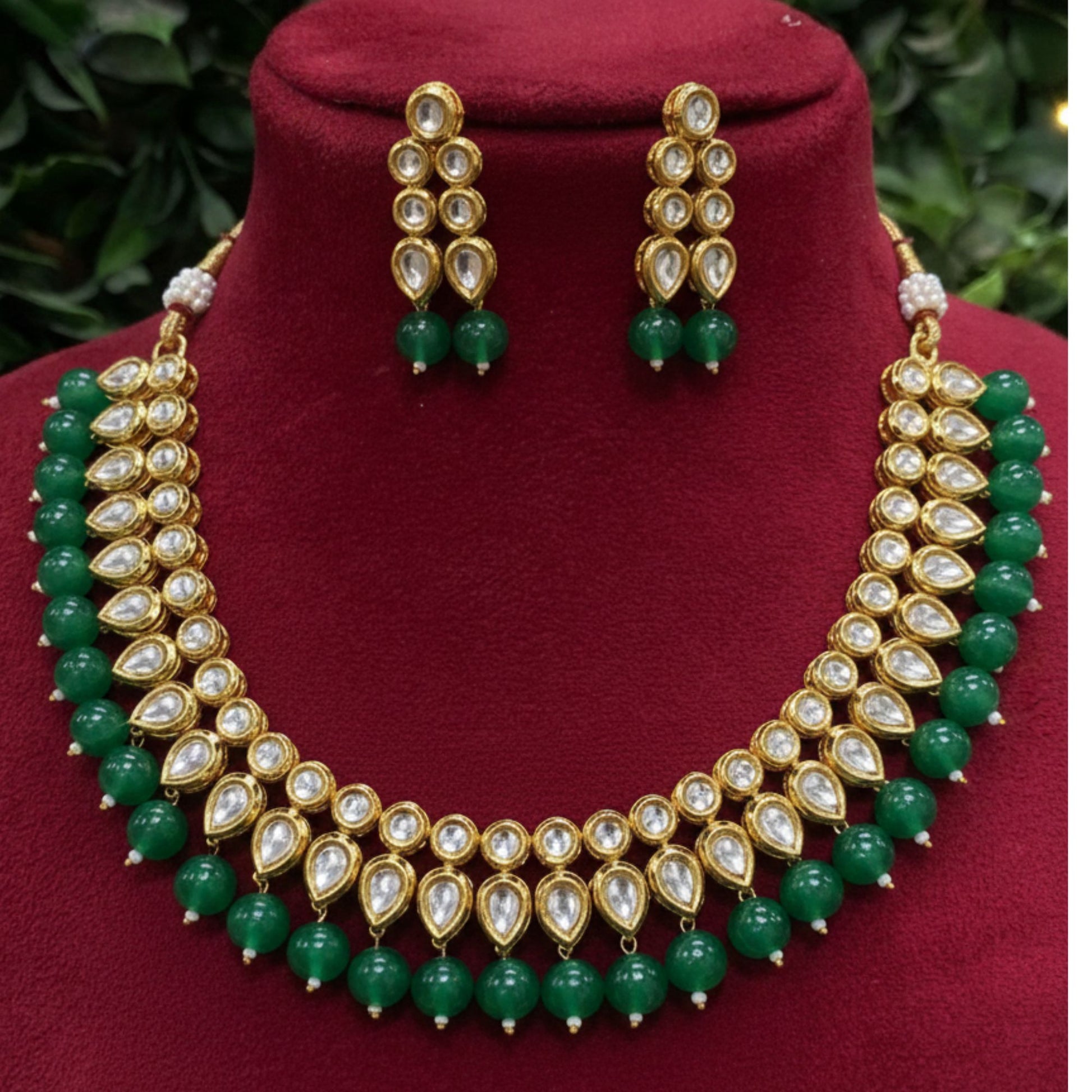 The FARAI EMERALD NECKLACE SET features stunning green beads and sparkling kundan stones. Handcrafted with precision, this set exudes elegance and sophistication, making it the perfect addition to any outfit. Enhance your style with this timeless necklace set.
