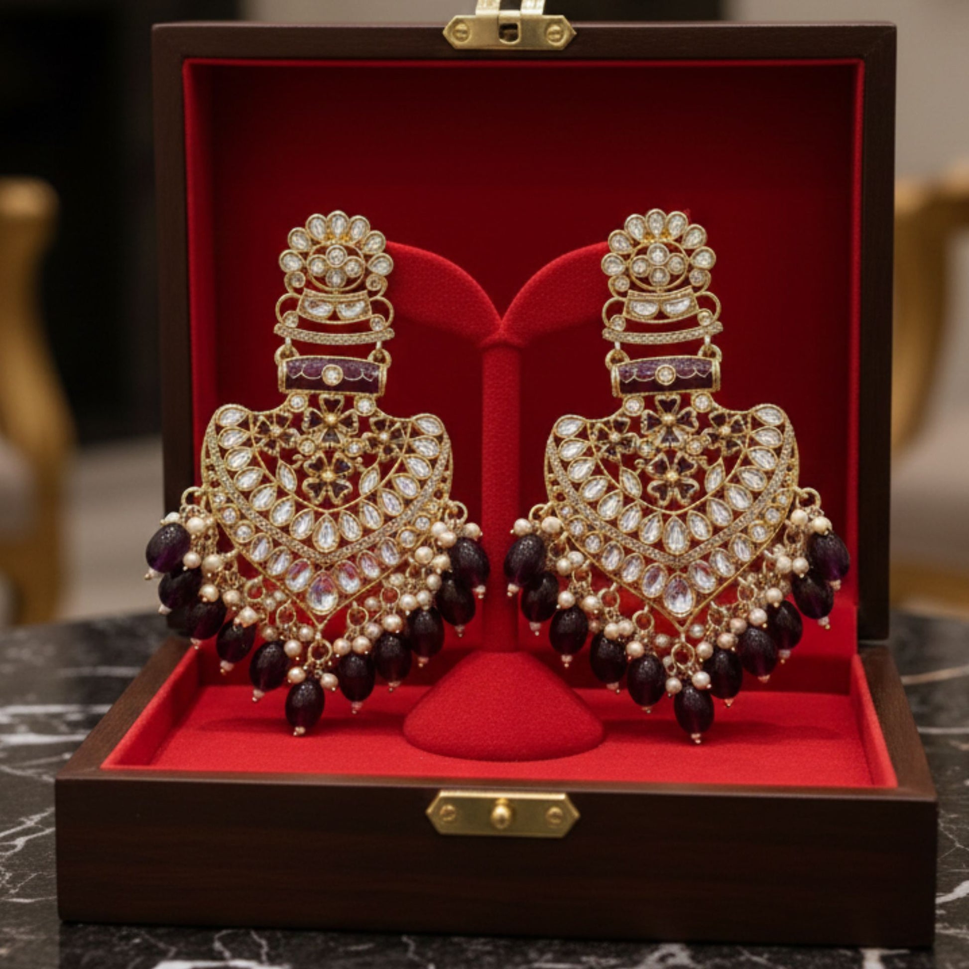 The FARIDA PURPLE CHANDBALI earrings boast a timeless design featuring a combination of stones, crystals, and pearls finished with intricate gold ornamentation. These traditional earrings add the perfect touch to any traditional outfit.