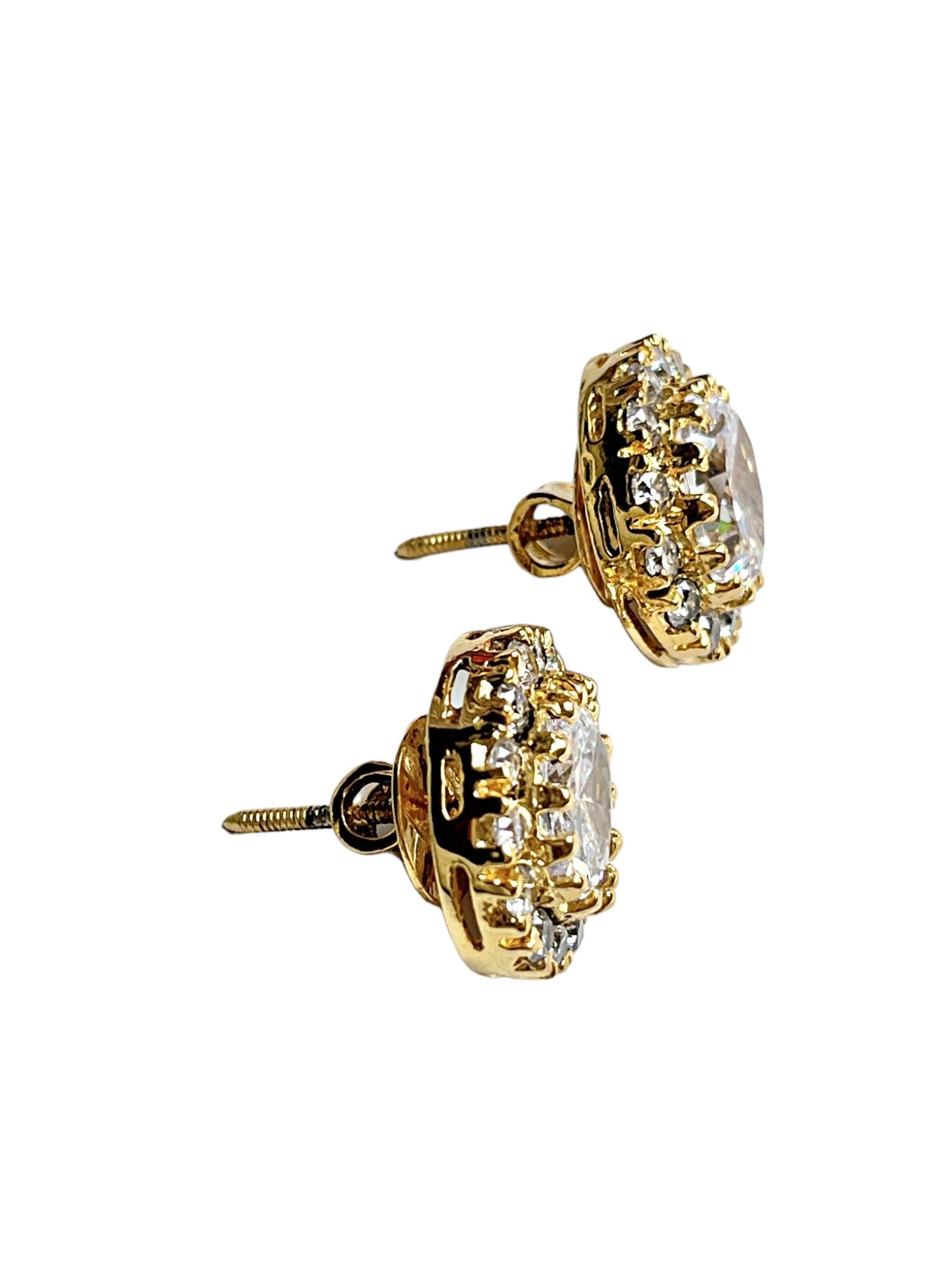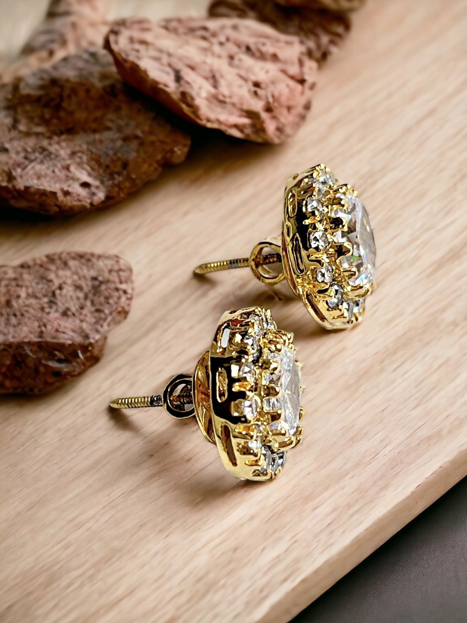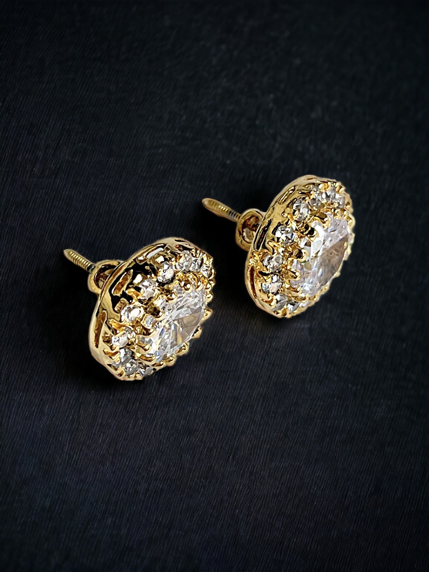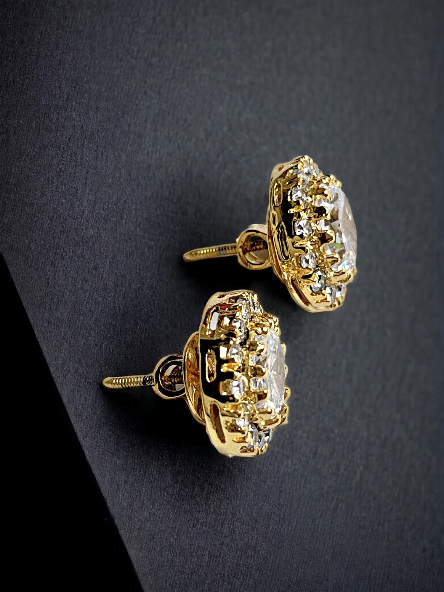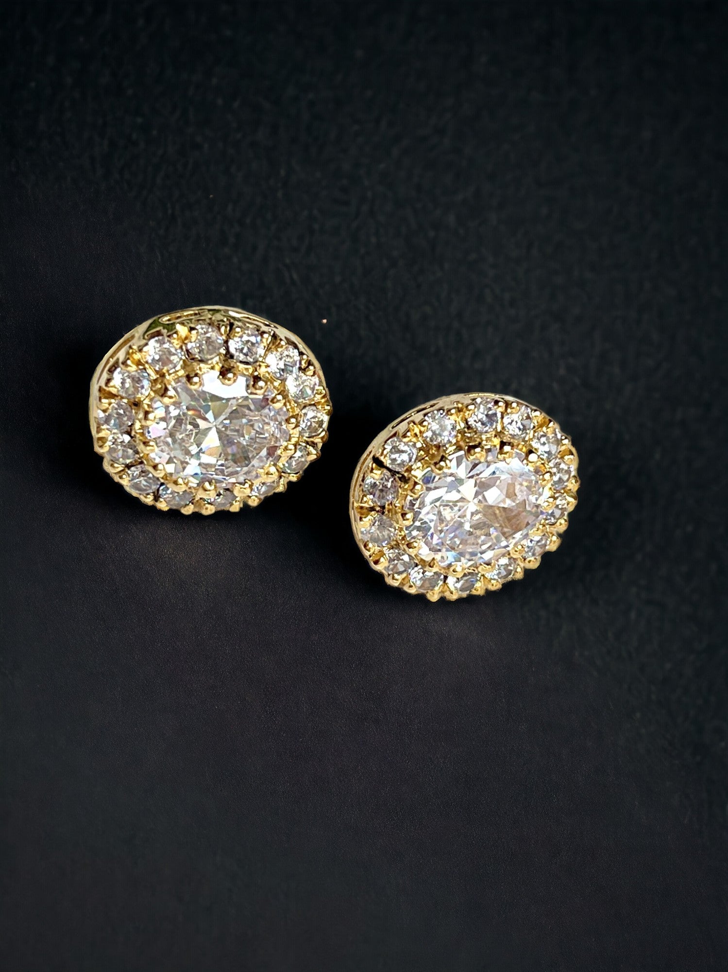 These FIZA GOLD ZIRCONIA STUDS are perfect for subtle yet stunning sparkle. Crafted with precision and adorned with dazzling simulated diamonds, these earrings will effortlessly elevate any ensemble. Add some glamour to your look with these affordable yet exquisite American diamond earrings.
