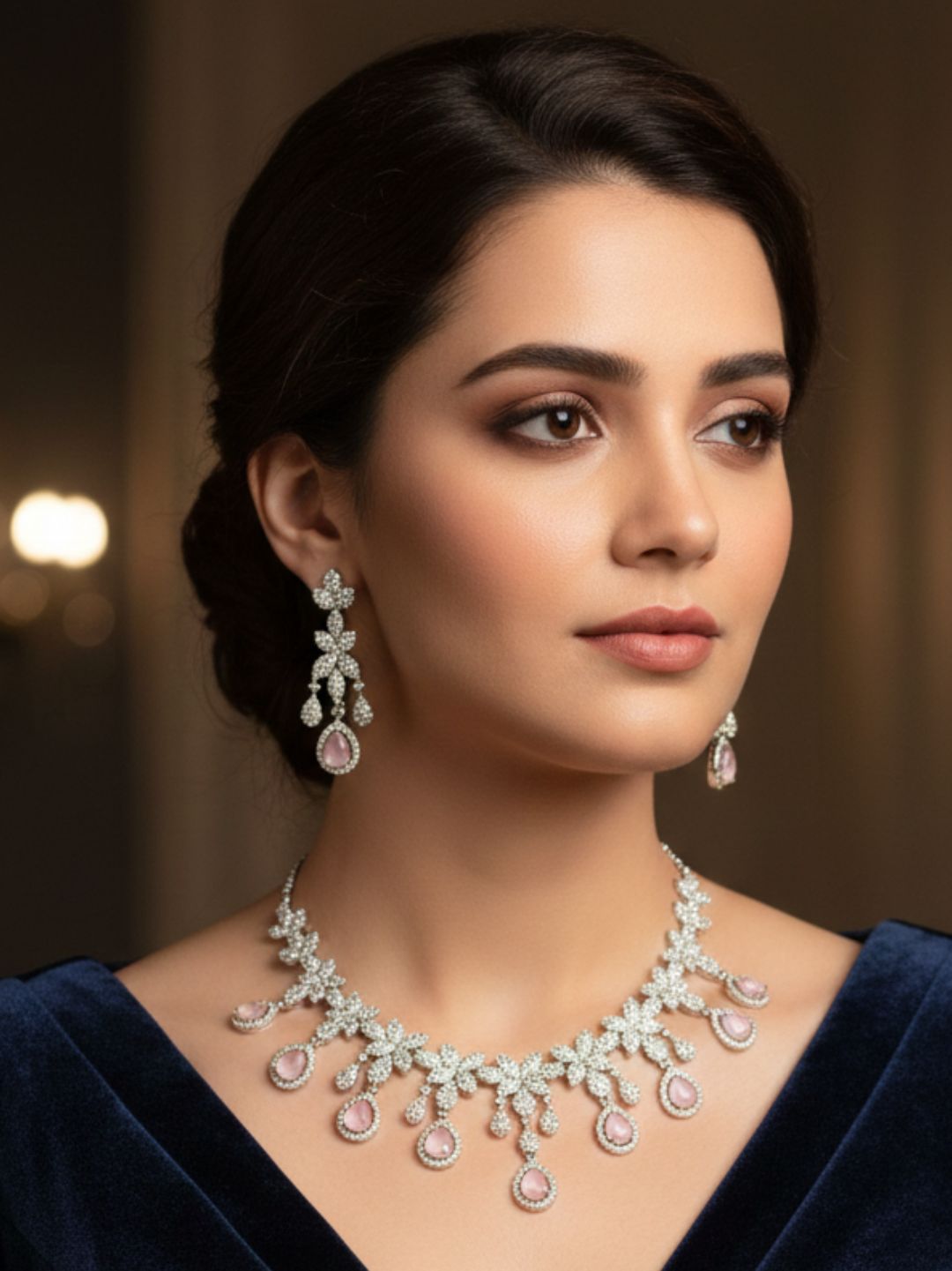 Adorned with intricate floral motifs and dazzling teardrop crystals, this jewellery set exudes celestial charm. Ideal for brides, receptions, and ethereal soirées.