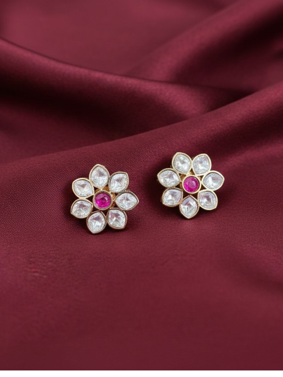 Add a pop of colour to your look with the Riva Pink Floral Kundan Studs. Designed in a delicate floral pattern, these studs feature shimmering white moissanite kundan stones with a vibrant pink centre, finished in a soft gold tone. Lightweight and comfortable, they are perfect for festive wear, weddings, poojas, and everyday ethnic styling. Pair them effortlessly with sarees, lehengas, kurtis, or Indo-western outfits.