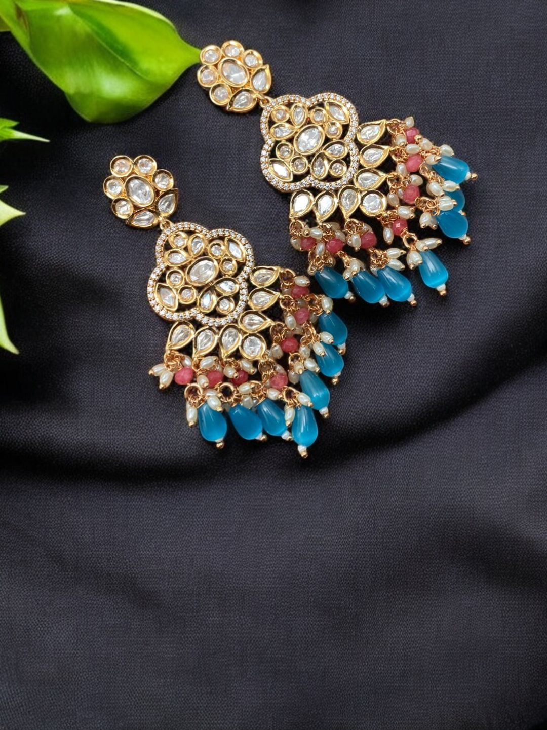 These stunning chandbali earrings feature an intricate kundan design adorned with shimmering white stones and vibrant clusters of blue, pink, and pearl beads. Crafted for festive and wedding wear, their rich, traditional style brings royal elegance to bridal and ethnic outfits. Lightweight yet statement-making, these earrings are perfect for celebrations, sangeet nights, or as a standout accessory for your festive wardrobe.