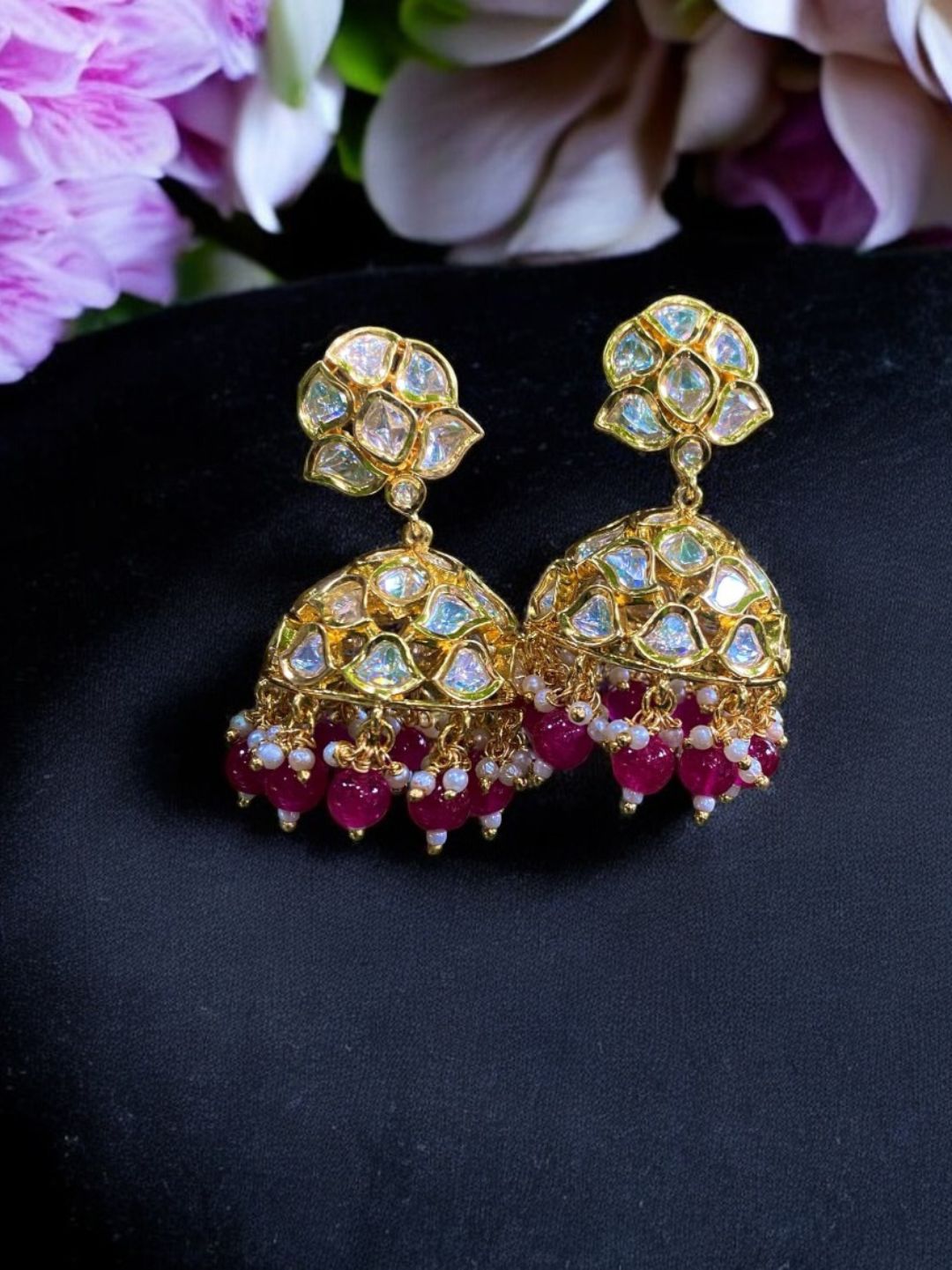 Elevate your ethnic look with these gold-plated RUBY KUNDAN JHUMKI adorned with pink and white pearls. These rustic-looking earrings add a touch of classic elegance to any outfit. Fulfill your desire for timeless, traditional style with these stunning earrings.