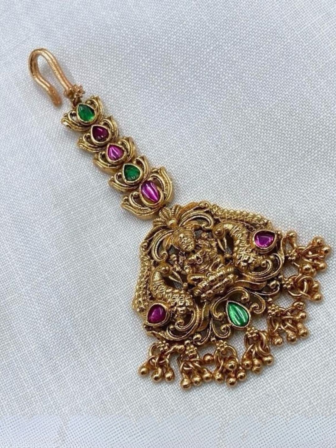 An intricately designed temple-style maang tikka showcasing Goddess Lakshmi surrounded by twin peacocks. Adorned with green and magenta stones, the piece is finished with antique gold detailing and traditional bead hangings. Perfect for brides and festive occasions, it reflects timeless South Indian craftsmanship and divine elegance. Add a royal touch to your look with this exquisite maang tika.