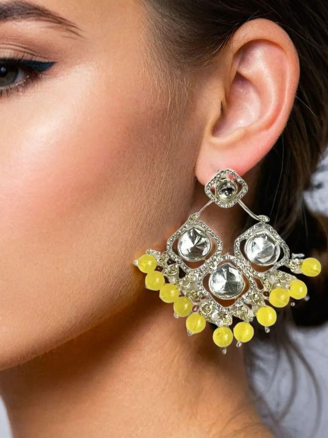 The VRUTTI yellow earrings bring a timeless look to your outfit. The yellow beads and kundan stones give the earrings a luxurious feel and the classic styling ensures that these will be a staple in your wardrobe for years to come.