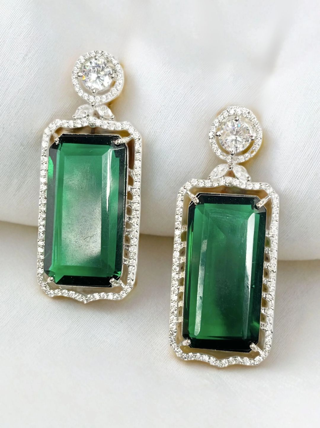Green is always the colour to add an elegant touch to any look. Adorn yourself with these ZUYA Green Earrings, featuring a big rectangular doublet stone and American diamond studs for a classic and sophisticated finish.