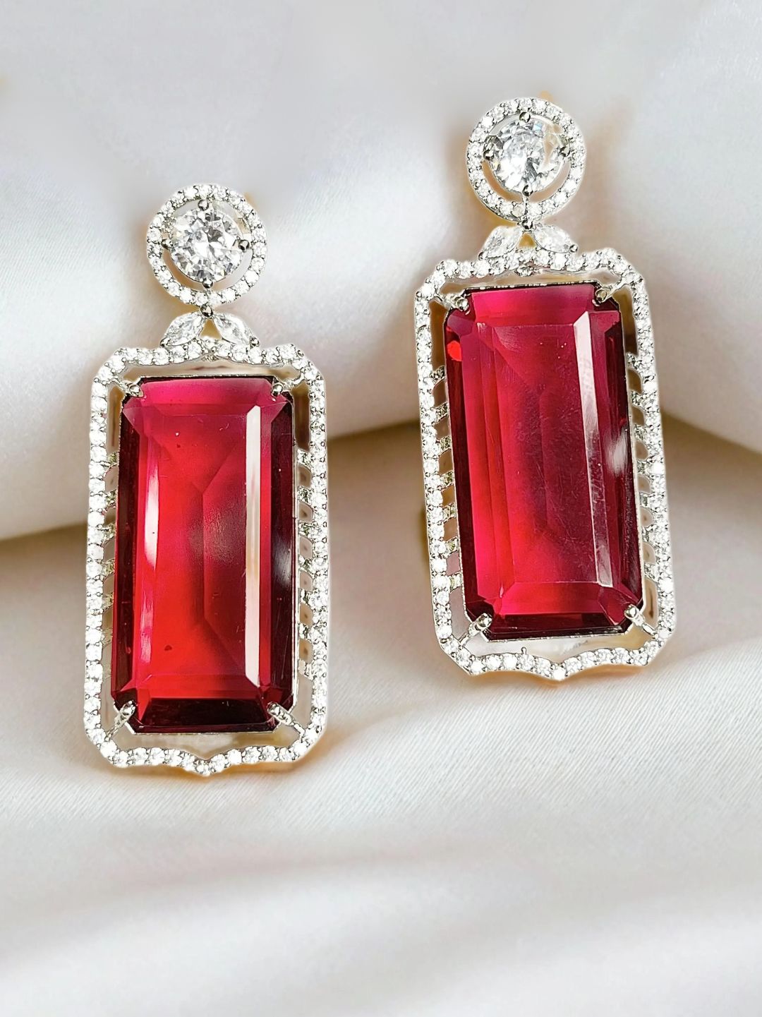 RUBY RED is always the colour to add an elegant touch to any look. Adorn yourself with these ZUYA Red Earrings, featuring a big rectangular doublet stone and American diamond studs for a classic and sophisticated finish.